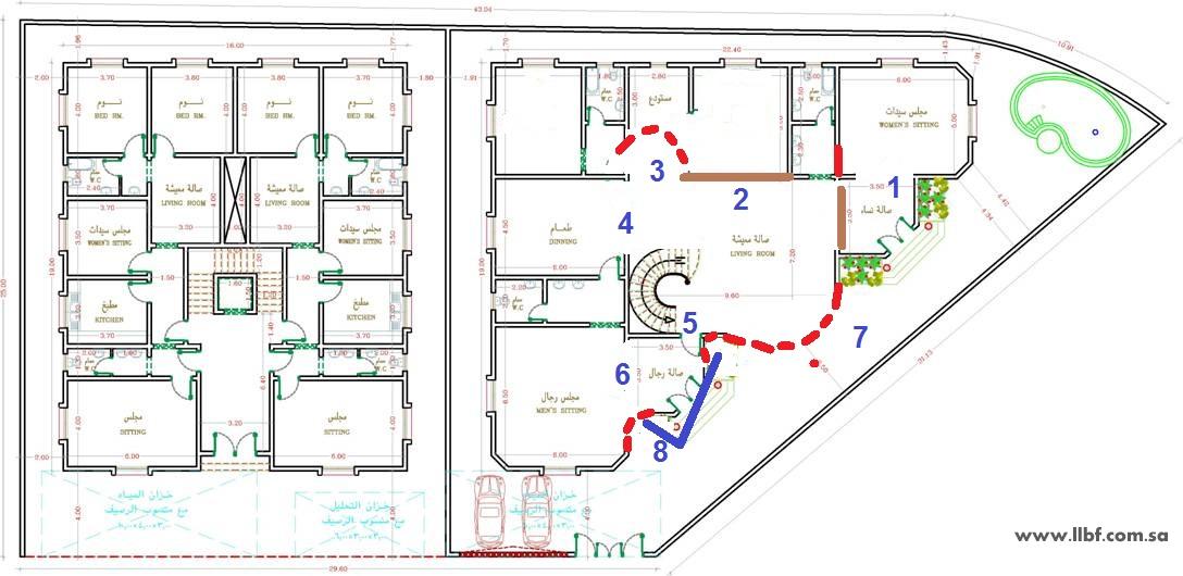 هلا بك أخي الكريم إليك بعض المقترحات 1 مجلس النساء ليس بحاجة إلى باب وارى أن يكون مفتوح على المدخل الباب المؤدي من مدخل النساء إلى الصالة لونه (بني) يكون سحاب لإضافة شيء من الاتساع البصري عند استخدام الصالة ومجلس النساء في وقت واحد المطبخ يتم نقله مكان غرفة النوم لأن البعض يرى أن المطبخ يضيف شيء من الجمال للمنزل وخاصة الصالة وهذا بخلاف الواقع فهنا تم إهدار مساحة نحن بأمس الحاجة لها خاصة من الناحية الوظيفية للمطبخ 2 الجدار هذا لونه (بني) يستخدم كجزء لأعمال الديكورات واللوحات وسيكون مؤثر جداً في جمالية الصالة وربما يكون هو المتنفس الوحيد للصالة لاستخدامه كقطعة فنية حيث أنه مصمت ولا يوجد به نوافذ وقد وقع في منطقة ممر 3 الموزع بين غرفة النوم والمطبخ ودورة المياه أرى أن يكون على شكل نصف دائرة فهنا أضاف شيء من التميز للفراغ وكأنه إضافة جمالية للصالة وشيء للخروج عن المألوف في الموزعات المعتادة والتي تسهم في قتل الجمالية للفراغات 4 باب غرفة الطعام يكون باب سحاب بحيث يتم إغلاقه فقط عند استخدام الطعام وبقية العام تكون الطعام جزء من الصالة الرئيسية للمنزل 5 بداية الدرج تكون من الجهة الثانية جهة مجلس الرجال لأن بداية الدرج هنا تكسب شيء بسيط من الجمال وفخامة للدرج لكن فيه هدر كبير من المساحة 6 مجلس الرجال ليس بحاجة إلى باب 7 جدار الصالة من الجيد أن يكون على شكل ربع دائرة ويتخلله عدد من النوافذ الطولية 8 باب مجلس الرجال بدلاً من أن تكون الجدران المحيطة بالباب من اليمين والشمال بشكل حاد فجيد أن يكون الباب عن يمينه وشماله (الجدران) على شكل ربع دائرة من الأرض وصولاً إلى نهاية المبنى من الأعلى سؤالي أين مدخل النساء من الشارع؟ هل المدخل واحد للمنزل؟ |