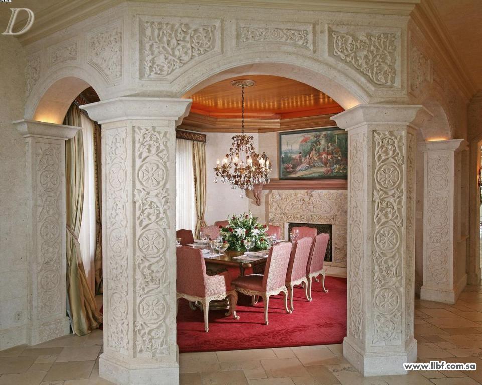 صالة الطعام مؤطرة بأعمدة و اقواس حجرية مزخرفة |