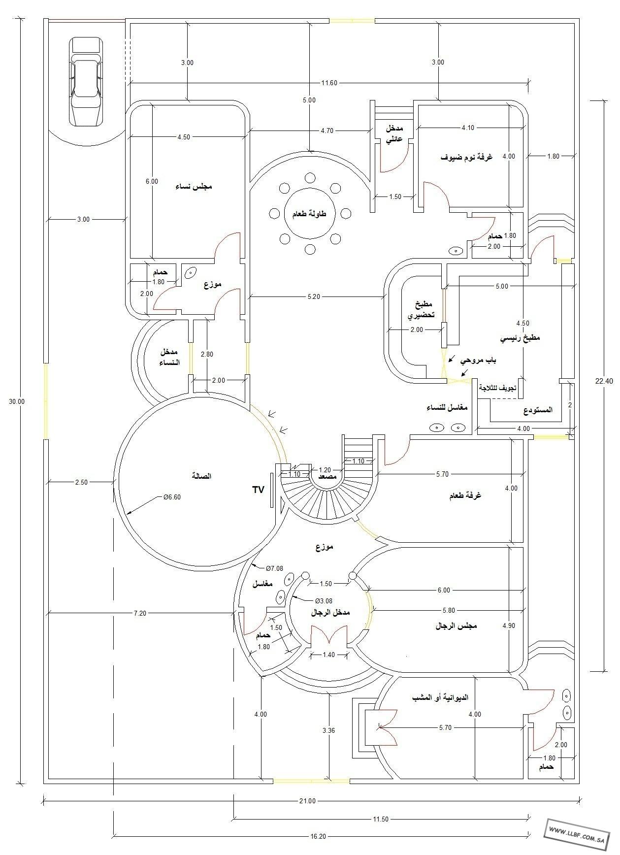 هلا خوي الفاضل اشكرك على ردك وتجاوبك . الغرف الدائريه تعطي جمال لكن تناسب المساحات الكبيره انا المساحه عندي لاتناسبها من ناحية العرض كذلك تضيع مساحه وانا ابي استغل المساحات بخصوص مخططك فيه جماليات ماشاء الله تبارك الله ملاحظاتي عليه مدخل النساء يفضل مايمر بدورة المياه تكون مثلا بجانب الصاله الدائريه كذالك سؤال اخوي ماهو البرنامج اللي عملت عليه المخطط ياليت تكرما لا امراً ترسل اسمه والرابط واكرر شكري |
